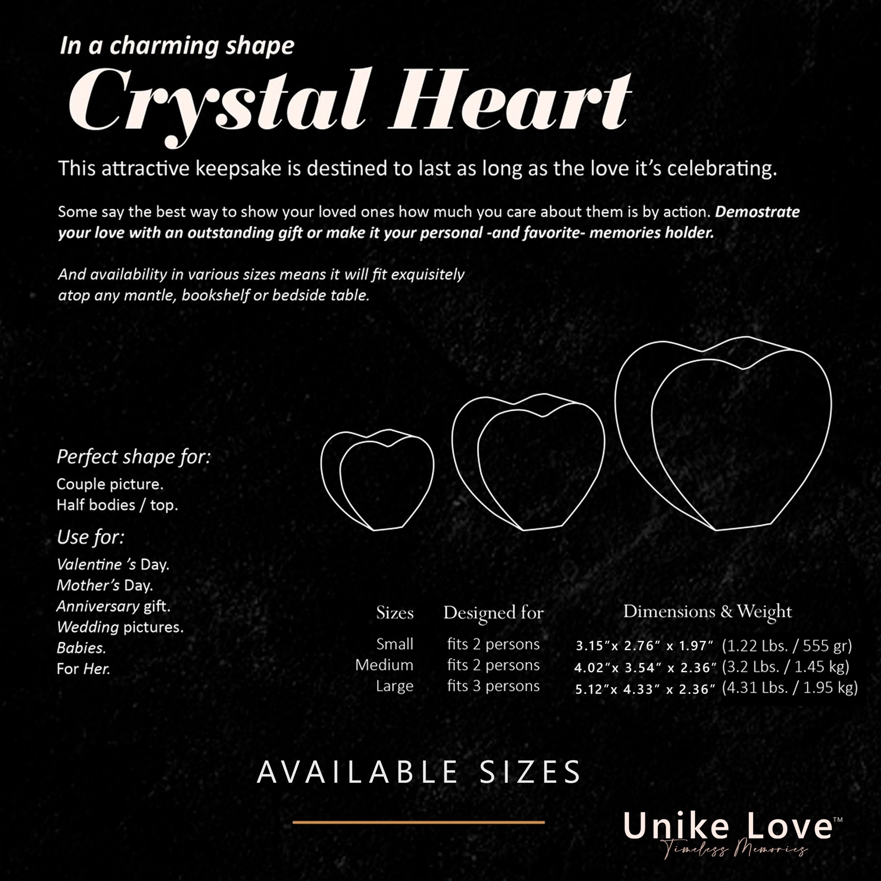 Each Heart Crystal is crafted from flawless, high-quality crystal and engraved using advanced 3D laser technology, capturing every detail with stunning clarity. Our professional designers optimize your photo by enhancing contrast, refining sharpness, and ensuring the perfect fit for the heart’s elegant shape. At Unike Love, this expert editing service is always included at no extra cost.