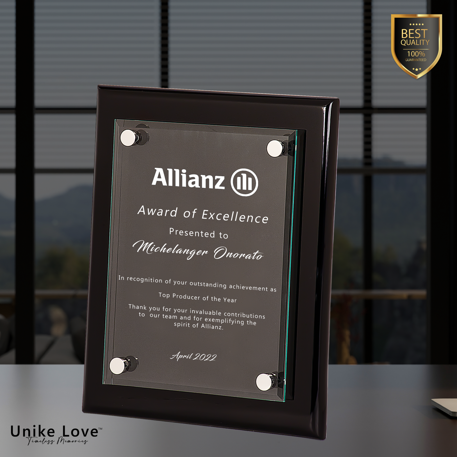 This floating glass plaque offers a generous engraving area for clear, professional customization. Perfect for: