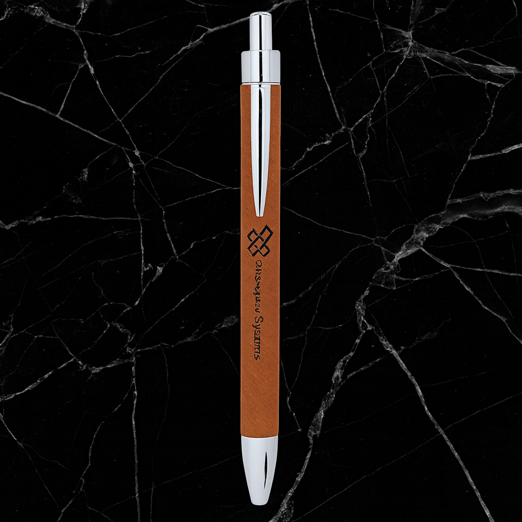 Featuring a rich rawhide brown leatherette body with sleek silver accents, this pen exudes natural warmth and professional elegance. Laser engraving reveals a bold black contrast, giving each pen a personal touch that stands out beautifully. Smooth, balanced, and timeless — it’s a pen that feels as good as it looks.