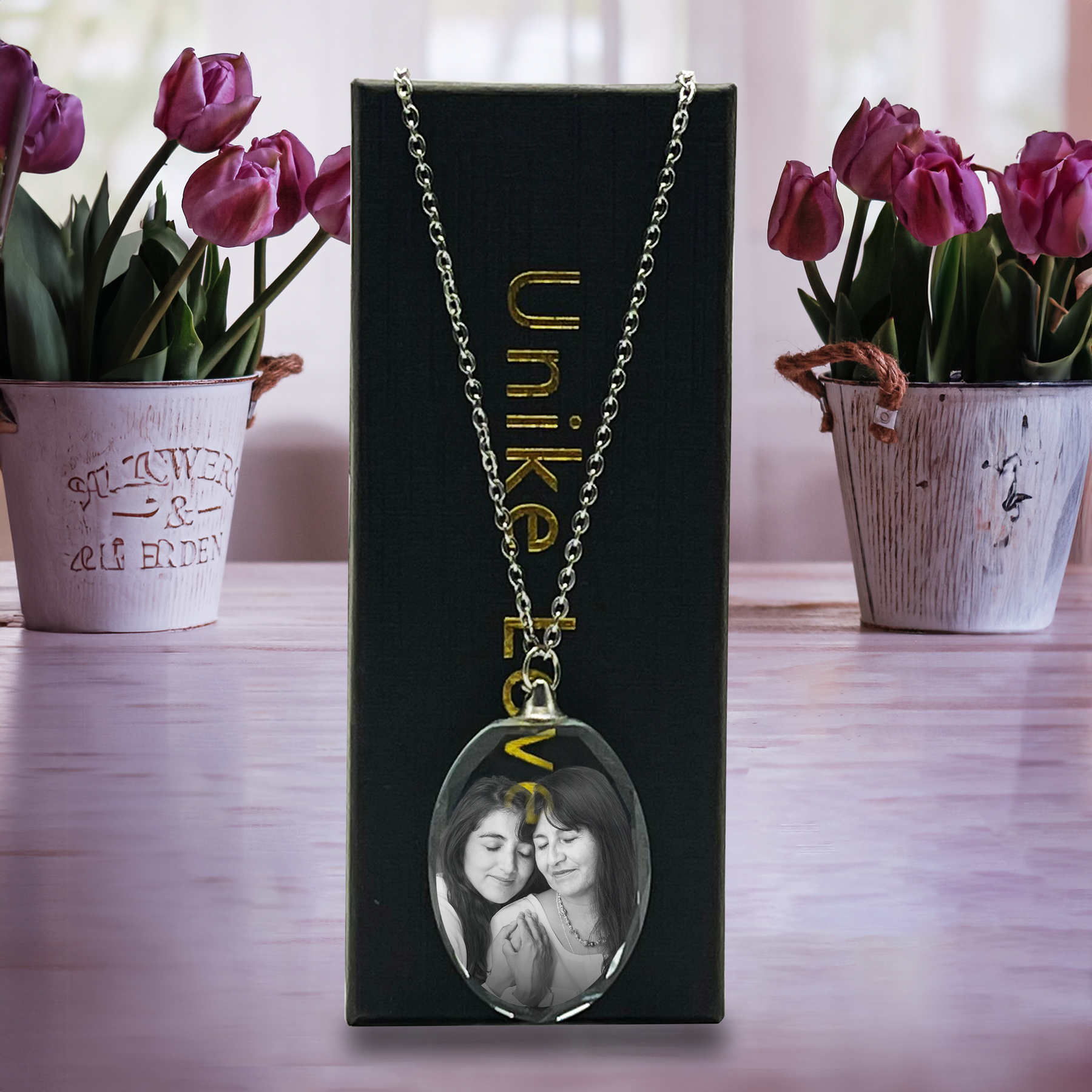 Express your eternal gratitude this holiday season with our oval-shaped crystal necklace. Each personalized engraving captures cherished memories, forming a timeless tribute to the love shared between you and your loved ones. As she wears this pendant close to her heart, let it serve as a constant reminder of the unwavering bond and endless affection you share.