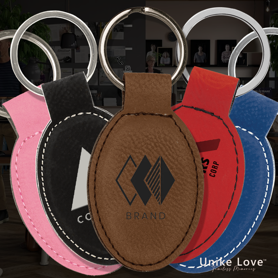 Customize your style with precision laser engraving or vibrant UV printing. Presenting our exquisite Oval Keychain available in Many Colors, adorned with silver, gold or black engravings on Leatherette. Elevate your accessories with a touch of opulence.